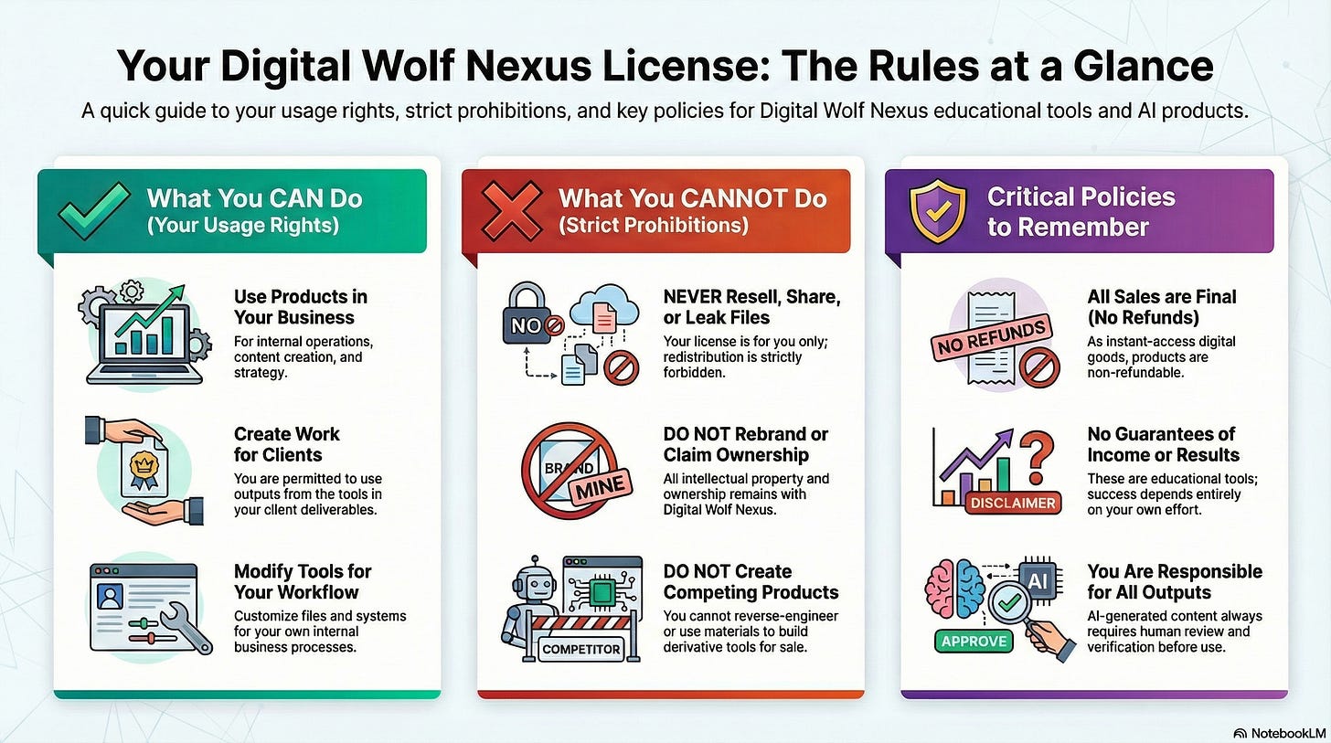 This Master Policy consolidates and governs all terms, licenses, disclaimers, privacy obligations, refund rules, AI usage terms, enterprise provisions, and white‑label conditions for Digital Wolf Nexus™.